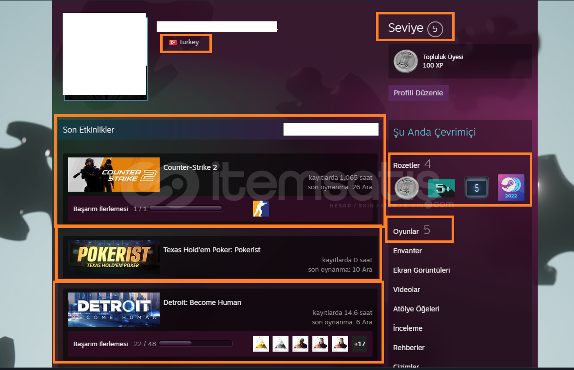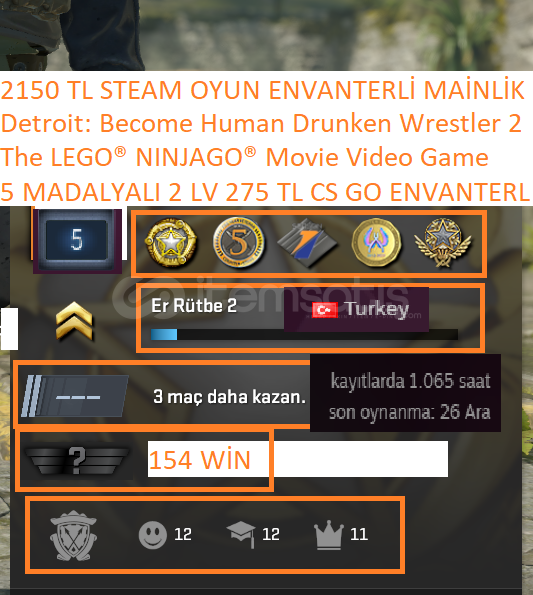 5 MADALYALI 2 LV 275 TL CS GO ENVANTERLİ 2150 TL STEAM OYUN ENVANTERLİ STEAM LV 5