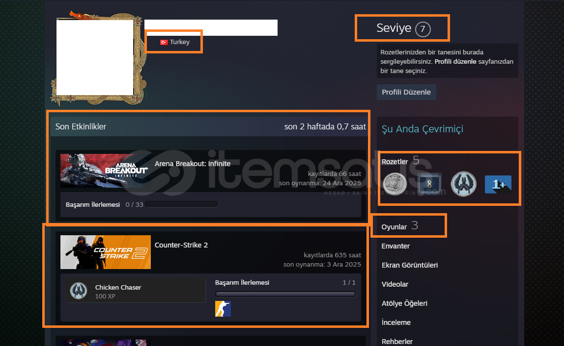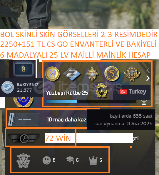 6 MADALYALI 25 LV 2250+151 TL CS GO ENVANTERLİ VE STEAM BAKİYELİ MAİLLİ MAİNLİK HESAP ACCMADALAYA:2021 2023 HİZMET MADALYASI 5 YIL JETON 2 SEZON JETON GLOBAL OFFİCE BADGE JETON SADAKAT ROZETİWİN:REKABETCİ : WİN YOLDAŞ:72 WİNPRİME RANK :REKABETCİ:BELİRSİZGÜVEN FAKTÖRÜ:YEŞİLCS GO SEVİYE:25 LV 2026 HİZMET MADALYASI ALICAKSTEAM LV:7 LVSTEAM PUAN:21.377 İSTEDİ...