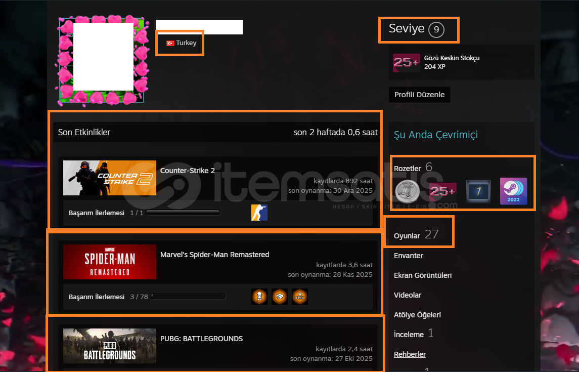 6 MADALYALI 25 LV TR HESABI GTA V ETS 2 Marvel’s Spider-Man Remastered 13.000 TL STEAM OYUN ENVANTERLİ STEAM LV 9