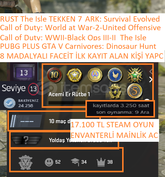 8 MADALYALI RUST PUBG PLUS GTA V Call of Duty: WWII-Black Ops III-II 17.100 TL STEAM OYUN ENVANTERLİ STEAM LV 13