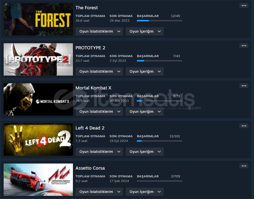 kullanmadığım ikince hesabımdır kaybetme tehlikesi yaşamazsınız ben zaten sadece kendi hesaplarımı satan biriyimfiyatta pazarlık yapamam kusura bakmayın paraya ihtiyacım varhesabın içinde paralı oyunlar mevcut asetto corsa/the forest/mortal kombat x/left 4 dead 2/hesapta seçkin var 4 tane de madalya oynamadım bile almazsan keyfin bilir
