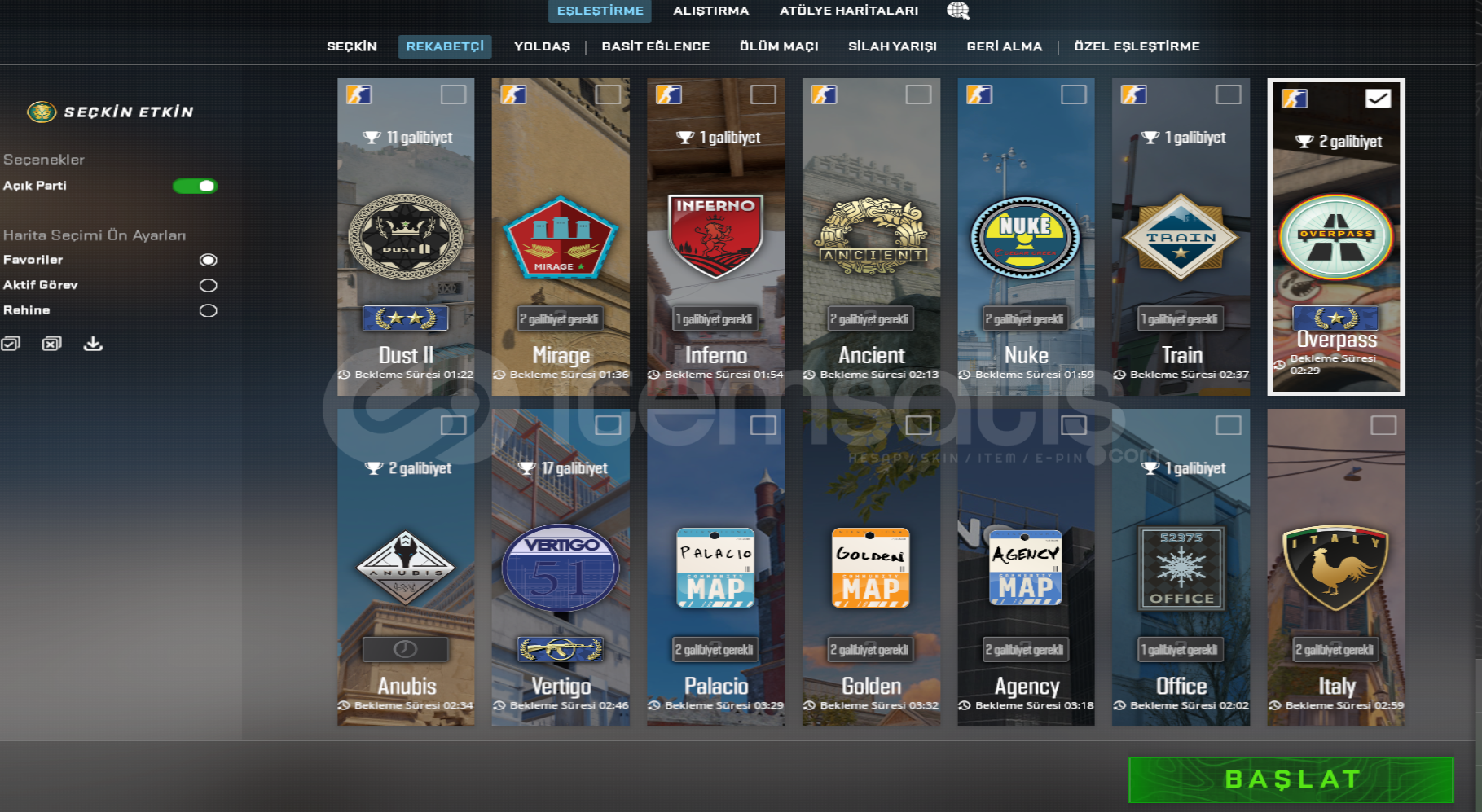 Rekabetçide Dust 2 ve Overpass'de Nova, Vertigo'da ise Seçkin Muhafız 2'dir