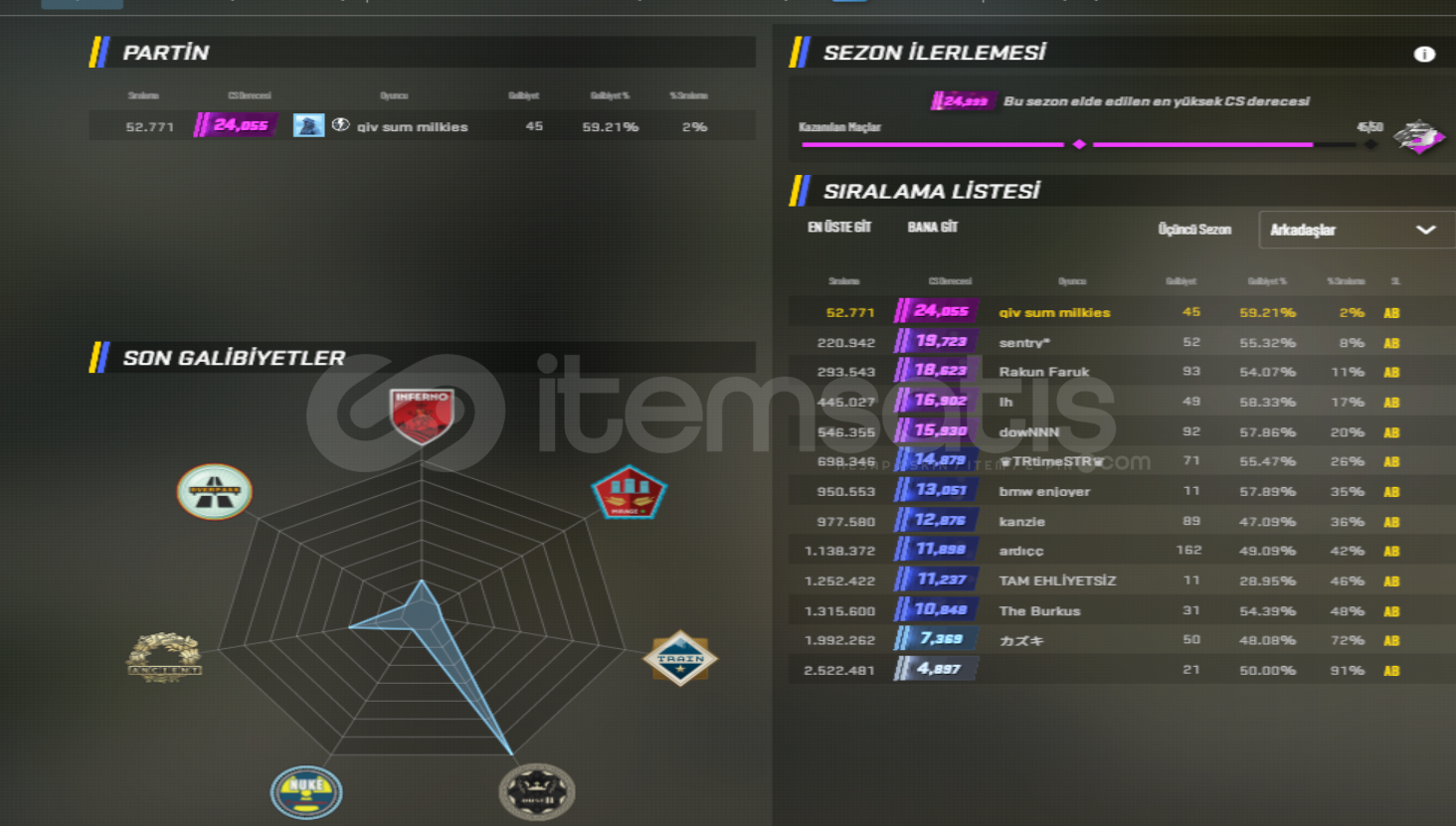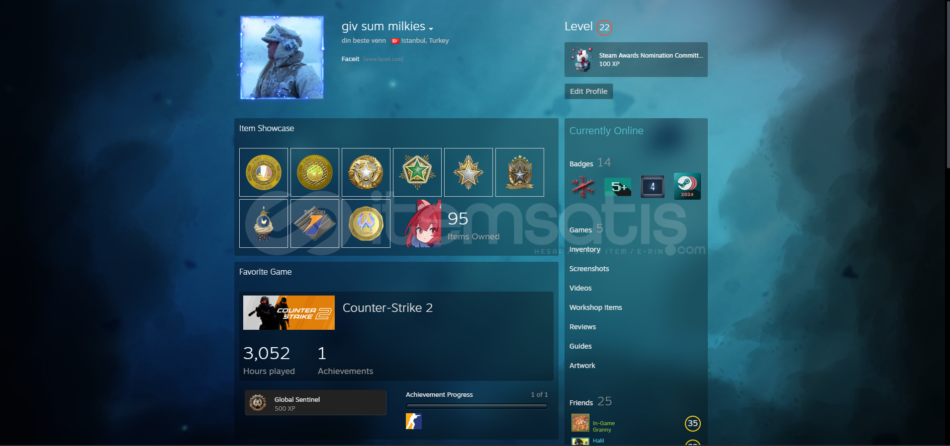 Faceit 2002 elo 2200 lere kadar çıkılmış 2kda ları bulmuş hesaptırPremier 24kYoldaş kartalDust 2 çift keleşve vertigoya kadar çoğu mapta nova ve üstü3070 saat cs221k steam points + 4 oyun teması + 5 farklı çerçeve kısacası mainlik hesaphesabın tüm bilgileri bende herşey teslim edilicekrio 2022 gold coinparis 2023 gold coinbidaki sezon pembe premier madalyasıda al...