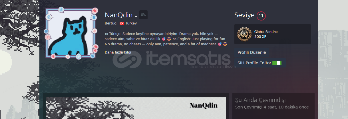 Hesap yaklaşık 1 aylık 108 saat cs2 var hesap seçkin durumda içinde bıcak ve eldiven hağriç çoğu silahta skin bulunuyor envanter değeri yaklaşık 25/30 dolar adasında rozet bulunmuyor.