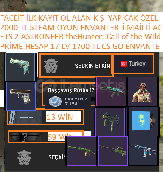 PRİME HESAP 17 LV 1700 TL CS GO ENVANTERLİ ETS 2 ASTRONEER 2000 TL STEAM OYUN ENVANTERLİ MAİLLİ MAİNLİK HESAP ACCMADALAYA:WİN:REKABETCİ :13 WİN YOLDAŞ:59 WİNPRİME RANK :REKABETCİ:BELİRSİZGÜVEN FAKTÖRÜ:YEŞİLCS GO SEVİYE:17 LV STEAM LV:2 LV HAREKETLİ ARKA PLAN MEVCUTSTEAM PUAN:7.154STEAM BAKİYE:CS GO SAAT:159İLK MAİL:ALDIM KİŞİNİN VERDİ...