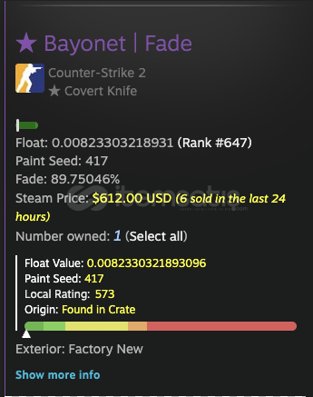 Float: 0.00823303218931 (Rank #647)Paint Seed: 417Fade: 89.75046%istediğiniz soru bilgi ne varsa verebilirim, reverse yok.inspect link paylaşabilirim.