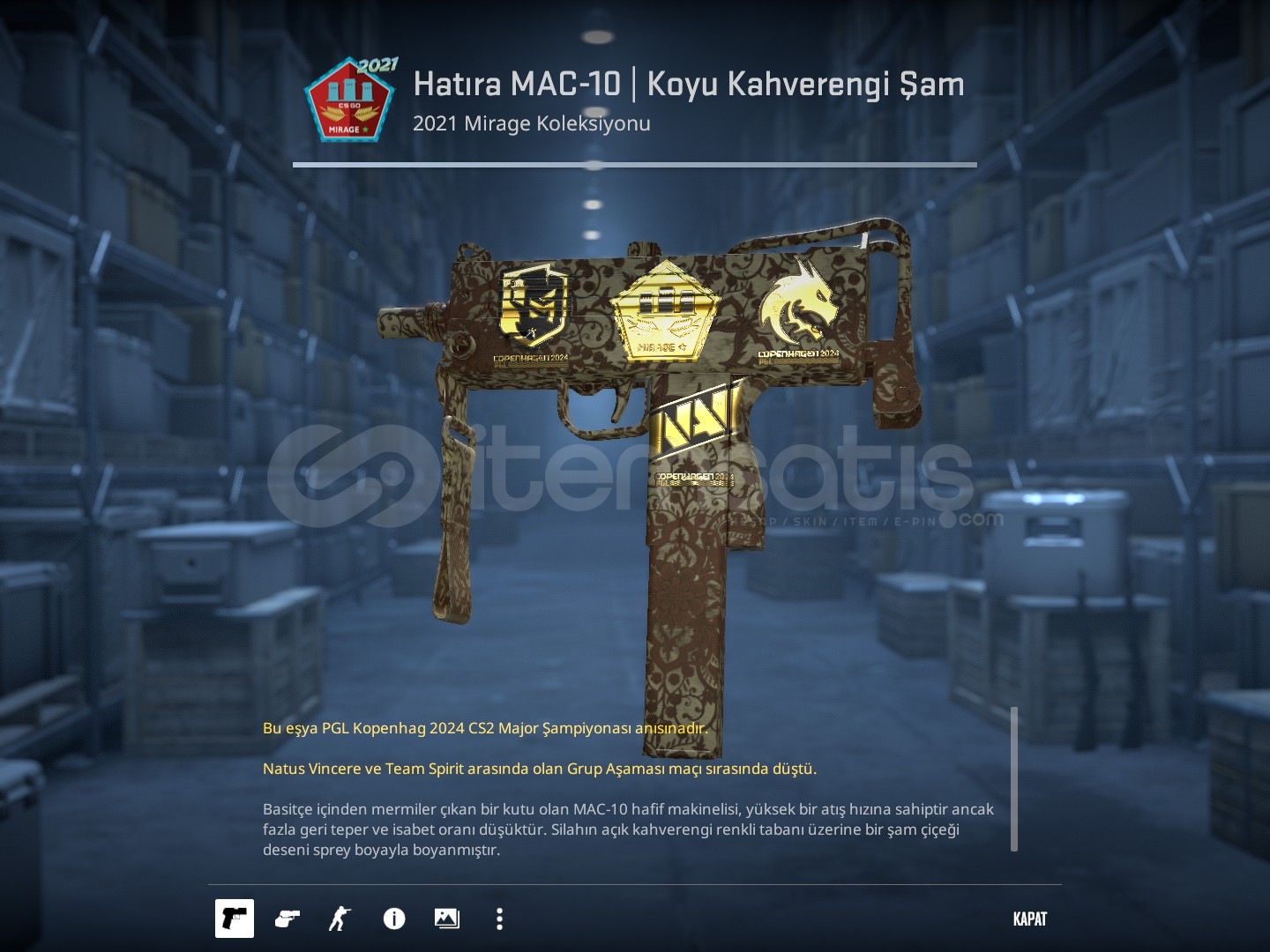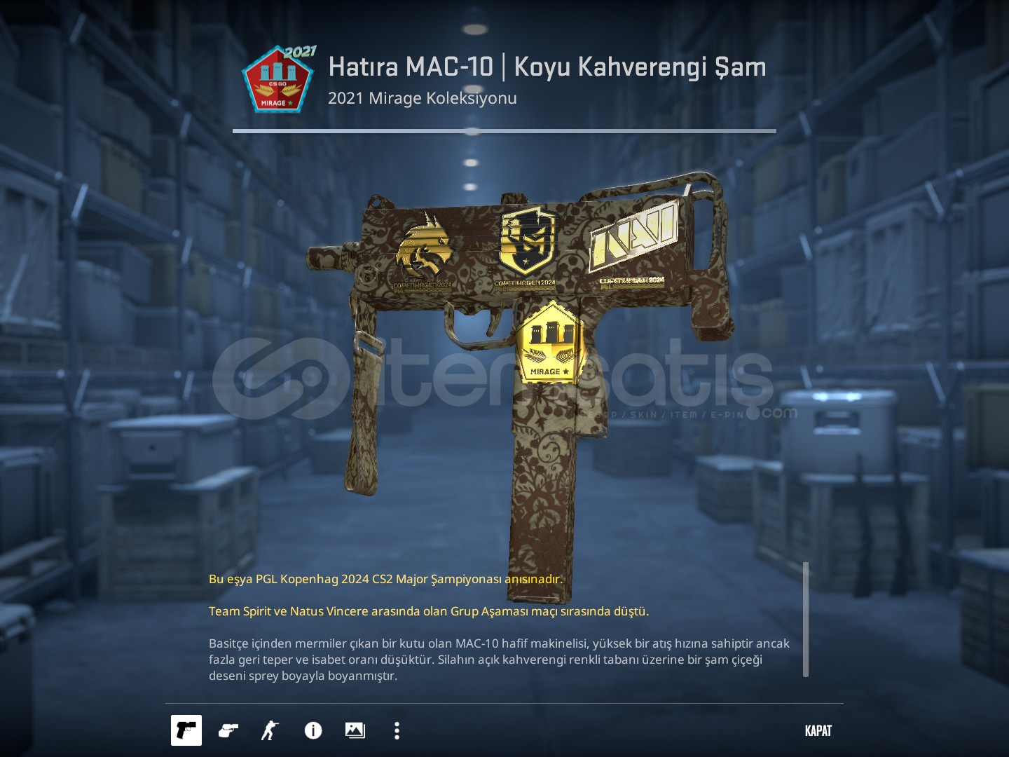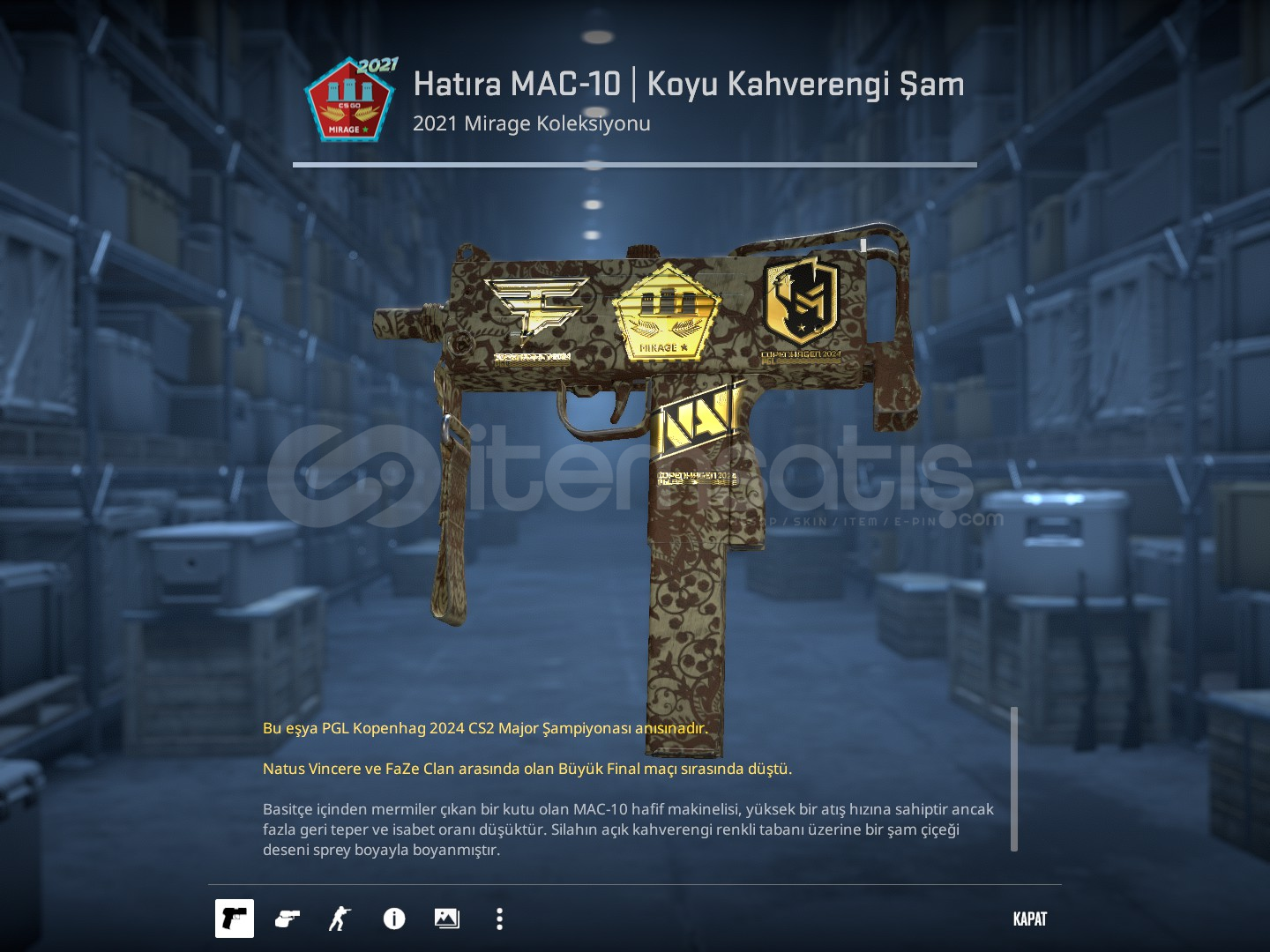 Hatıra MAC-10 | Koyu Kahverengi ŞamDış Görünüş: Fabrikadan Yeni ÇıkmışBu eşyalar PGL Kopenhag 2024 CS2 Major Şampiyonası anısınadır.ÜZERİNDEKİ ÇIKARTMALAR: PGL (Altın) | Kopenhag 2024 $1.33Mirage (Altın) ?Natus Vincere (Altın) | Kopenhag 2024 $7.54FaZe Clan (Altın) | Kopenhag 2024 $6.77-İlanı Aldım Ama Bana Nasıl vericeksin?-Steam Trade URL niz...