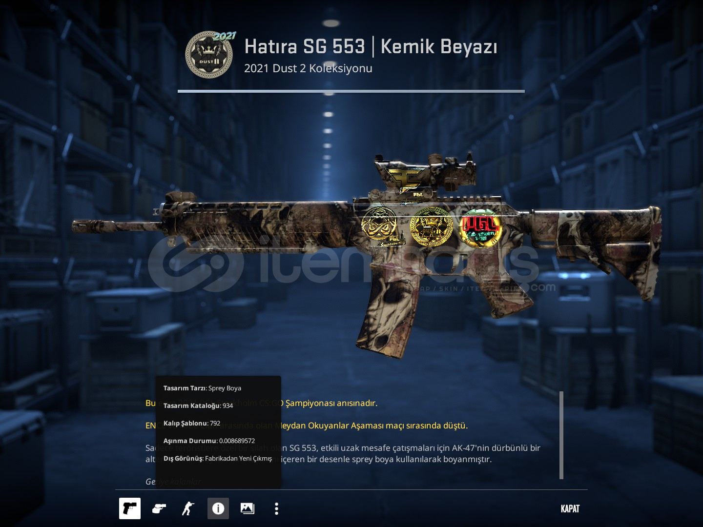 Hatıra SG 553 | Kemik Beyazı (FN) FABRİKADAN YENİ ÇIKMIŞ-Bu eşya 2021 PGL Stockholm CS:GO Şampiyonası anısınadır. -ENCE ve FaZe Clan arasında olan Meydan Okuyanlar Aşaması maçı sırasında düştü.ÜSTÜNDEKİ ÇIKARTMALAR:PGL (Altın) | Stockholm 2021 $4.19Dust II (Altın)ENCE (Altın) | Stockholm 2021 $6.57FaZe Clan (Altın) | Stockholm 20...