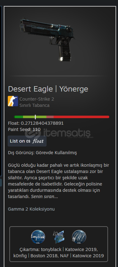 -Desert Eagle | Yönerge -Sınırlı TabancaÇıkartmalar: tonyblack | Katowice 2019 $3.94 k0nfig | Boston 2018 $1.80NAF | Katowice 2019 $0.93Toplam: $6.67 Yani ~ 276.84 TL -------------------------------------+350 BAŞARILI İŞLEM-İlanı Aldım Ama Bana Nasıl vericeksin?-Steam Trade URL nizi yazmanız yeterlidir.-Hafta İçi 09.00-01.00-Hafta Sonu 12.00-02.00Müşteriler Bu saatler İçinde Alırlarsa A...