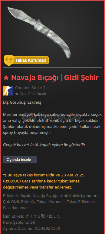CS2 Navaja Bıçağı SatılıkDeğer: 85$Temiz görünümAkıcı animasyonSatış için idealHızlı satılabilecek, fiyat/performans açısından güçlü bir bıçak.