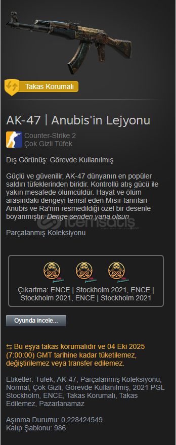 Dış Görünüş: Görevde KullanılmışAşınma Durumu: 0,228424549Güçlü ve güvenilir, AK-47 dünyanın en popüler saldırı tüfeklerinden biridir. Kontrollü atış gücü ile yakın mesafede ölümcüldür. Hayat ve ölüm arasındaki dengeyi temsil eden Mısır tanrıları Anubis ve Ra'nın resmedildiği özel bir de...