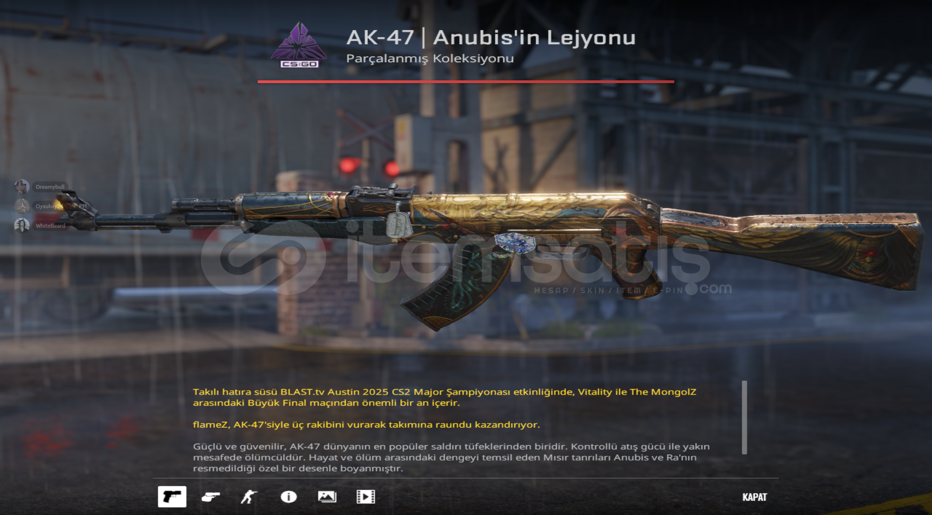 üründe hatıra süs olup aşınması çok düşüktür nadir float olması nedeniyle eşsiz ve benzersiz bir skin sizin olacaktırNadir float yüzünden silahı elinizde tutarken factory new gibi durmaktadır. Aşınması tetik altı gibi gözle görünmeyen yerlerdedirüstündeki süs flamezin austin 2025de ak-47 silahı ile yaptığı raund kahramanlı...