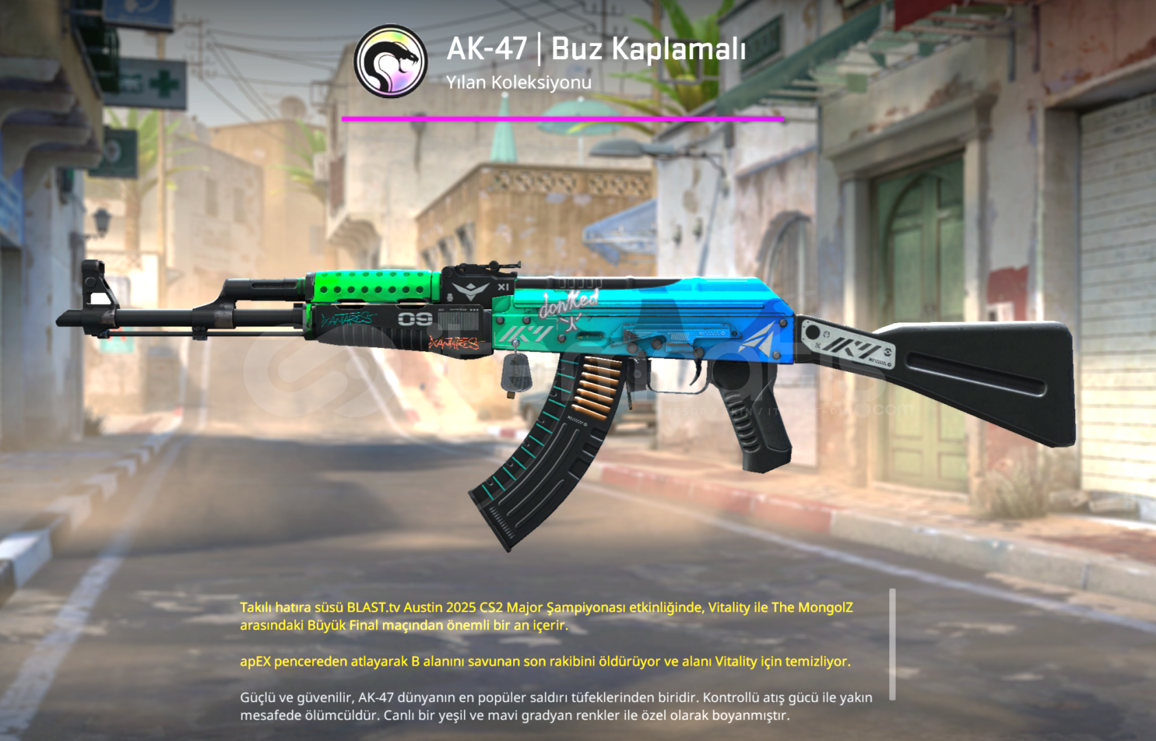 Etiketler: Tüfek, AK-47, Yılan Koleksiyonu, Normal, Önemli An, Gizli, Az Aşınmış, BLAST.tv Austin 2025, Perfect World Şanghay 2024, Vitality, The MongolZ, Team Spirit, Aurora, DONK (Danil Kryshkovets), XANTARES (İsmailcan Dörtkardeş)