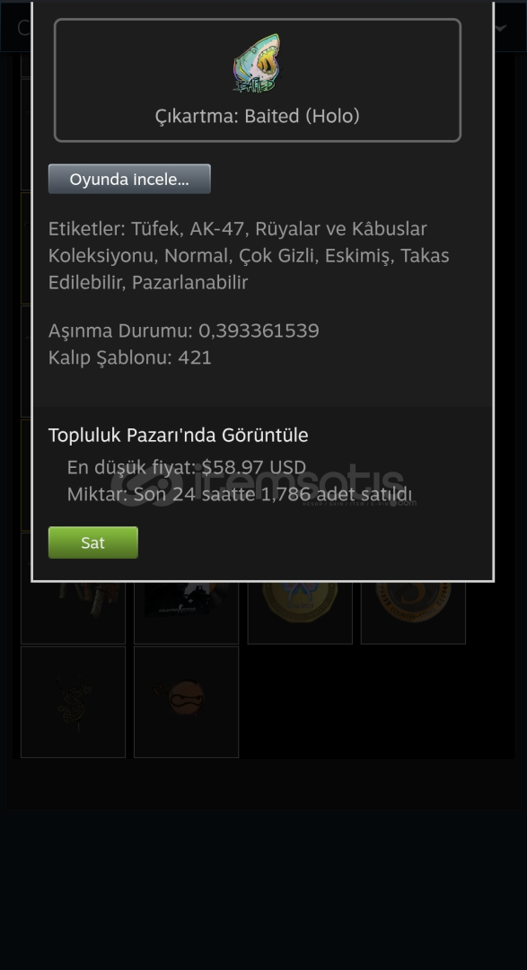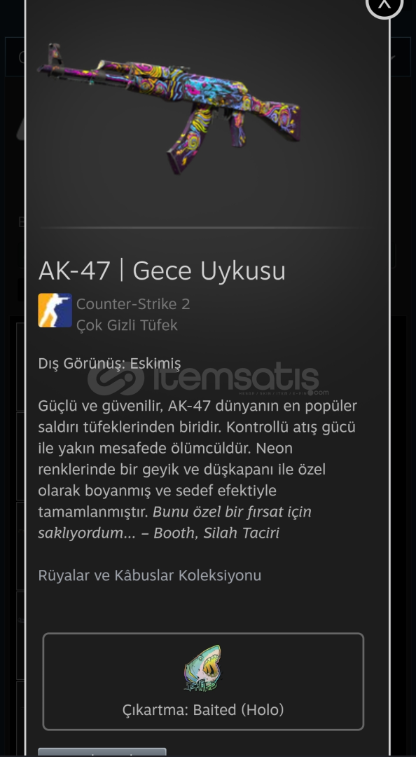 Baited (Holo) çıkartma bulunmaktadır. Site seçenklerinde silah durumu yerinde eskimiş seçeneği bulunmadığı için az aşınmız yazmak zorunda kaldım. Ödeme yapıldığı anda skin steamden trade yoluyla aktarılacaktır. Alana hayırlı olsun.
