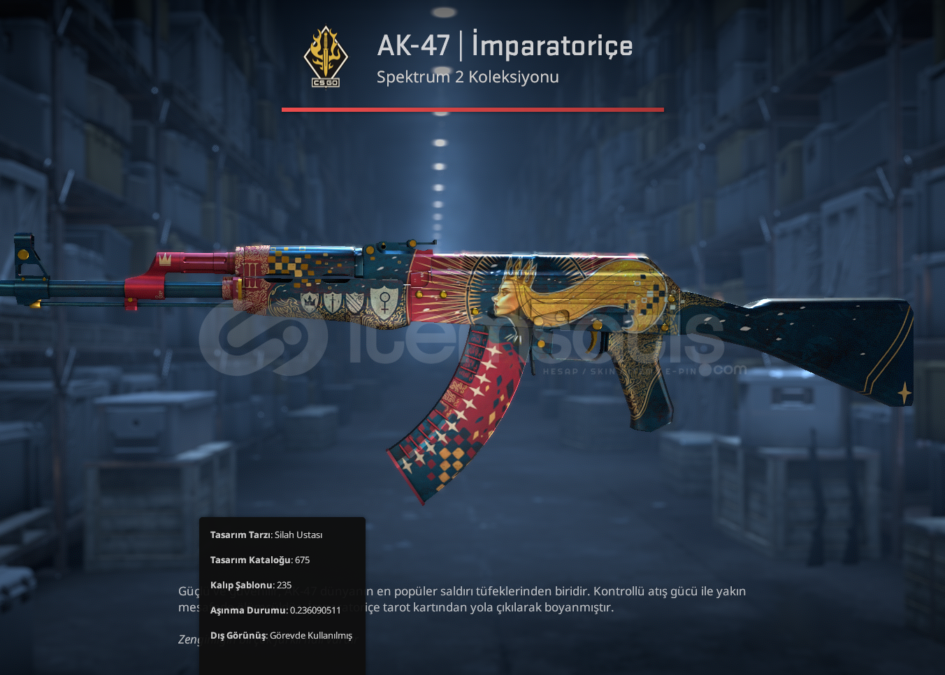 Tür : TüfekSilah : AK-47Koleksiyon : Spektrum 2 KoleksiyonuNitelik : NormalNadirlik : Çok GizliDış Görünüş : Görevde KullanılmışGüçlü ve güvenilir, AK-47 dünyanın en popüler saldırı tüfeklerinden biridir. Kontrollü atış gücü ile yakın mesafede ölümcüldür. İmparatoriçe tarot kartından yola çıkılar...
