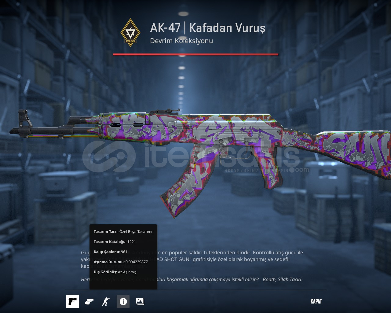 Satışta olan AK-47 | Kafadan Vuruş skin’i tamamen orijinaldir ve envanterimde aktif olarak bulunmaktadır. Özel boya tasarımına sahip bu model, temiz görünümü ve nadir şablonuyla koleksiyoncular için oldukça değerli bir parçadır. Aşınma değeri düşük olduğu için görsel olarak çok iyi durumdadır.