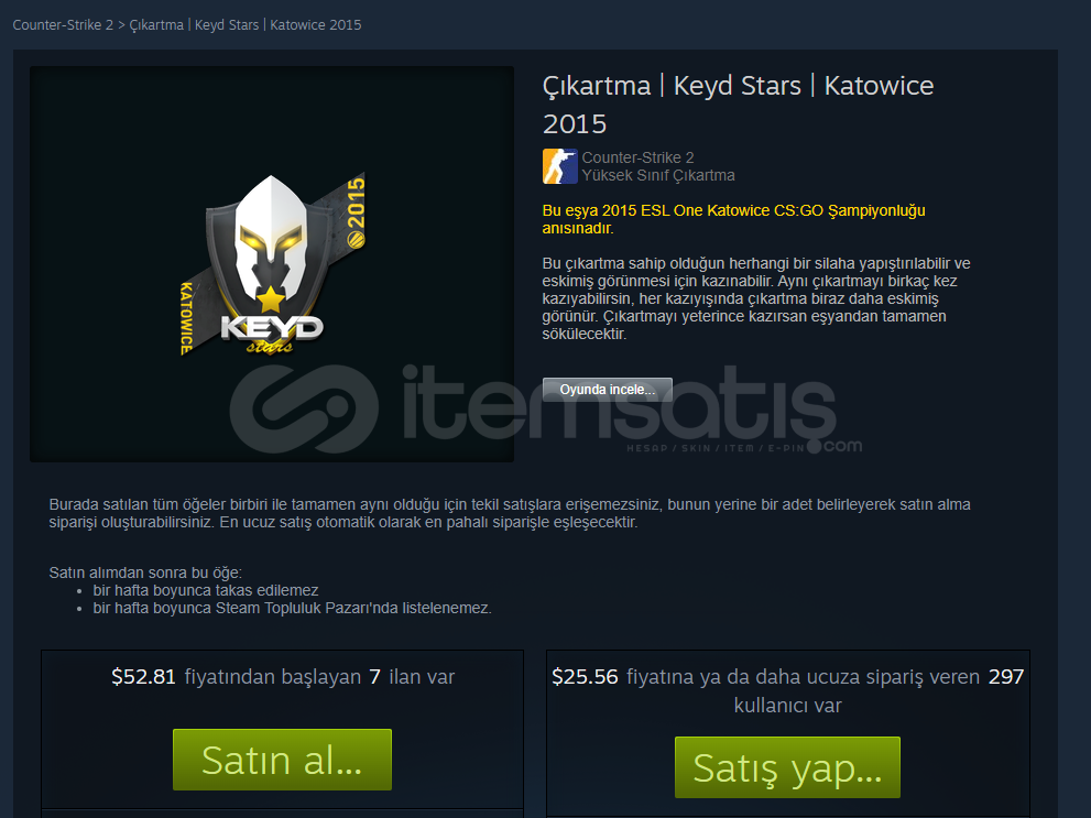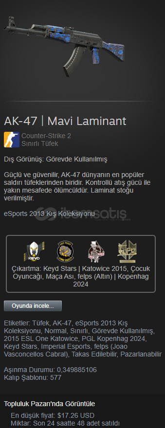 Ürünümüz AK-47 Mavi Laminant'dır üstünde farklı fiyatlarda 2 ile 4 dolar arasında stickerlar mevcuttur.Aralarından 1 Adet çıkartma ise Keyd Stars Katowice 2015 mevcuttur.Silah 17 dolar Sticker 50 dolardır ekstra kalan çıkartmaların ücretleri yazılmamıştır.