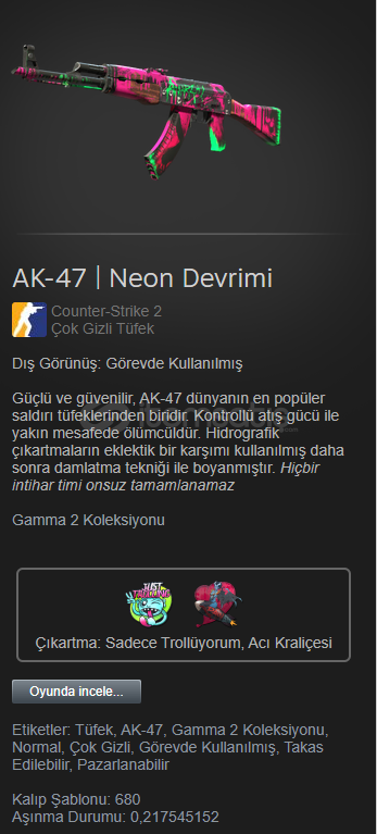 Float: 0.21TRADE İLE GÖNDERİLİR!Steam hesabınızın trade banı olmamalıdır.Steam hesabınızın envanter gizliliği HERKESE AÇIK Olmalıdır.Daha fazla skin için ilanlarıma göz atabilirsiniz.Aktif olmamı beklemeden satın alabilirsiniz.Otomatik teslimat değildir. TESLİMAT EN GEÇ 12 SAAT İÇİNDE YAPILIR.Çıkartma: Sadece Trollüyorum, A...