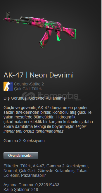Float: 0.23TRADE İLE GÖNDERİLİR!Steam hesabınızın trade banı olmamalıdır.Steam hesabınızın envanter gizliliği HERKESE AÇIK Olmalıdır.Daha fazla skin için ilanlarıma göz atabilirsiniz.Aktif olmamı beklemeden satın alabilirsiniz.Otomatik teslimat değildir. TESLİMAT EN GEÇ 12 SAAT İÇİNDE YAPILIR.