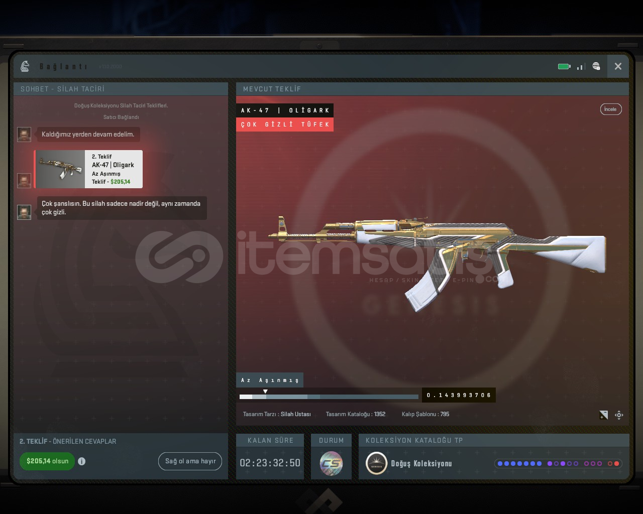 16 Ekim saat 00.30'da terminalden çıktı 3 günü var 200 dolar teklif pazarda şu an 300 dolar ve çok daha yükselir ama site komisyonlarıyla vs uğraşmak istemediğim için temizinden 260 dolardan satıyorum parasını yollayan olursa skini alır ona yollarım.