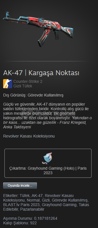 Float: 0.18TRADE İLE GÖNDERİLİR!Steam hesabınızın trade banı olmamalıdır.Steam hesabınızın envanter gizliliği HERKESE AÇIK Olmalıdır.Daha fazla skin için ilanlarıma göz atabilirsiniz.Aktif olmamı beklemeden satın alabilirsiniz.Otomatik teslimat değildir. TESLİMAT EN GEÇ 12 SAAT İÇİNDE YAPILIR.Çıkartma: Grayhound Gaming (Holo) | ...