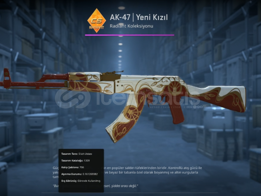 Tür : TüfekSilah : AK-47Koleksiyon : Radiant KoleksiyonuNitelik : NormalNadirlik : GizliDış Görünüş : Görevde KullanılmışFloatı 0,16 olduğu için az aşınmış gibi görünüyordur