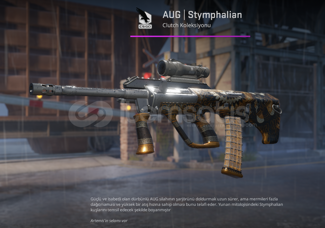 Tür : TüfekSilah : AUGKoleksiyon : Clutch KoleksiyonuNitelik : NormalNadirlik : GizliDış Görünüş : Görevde KullanılmışGüçlü ve isabetli olan dürbünlü AUG silahının şarjörünü doldurmak uzun sürer, ama mermileri fazla dağıtmaması ve yüksek bir atış hızına sahip olması bunu telafi eder. Yunan mitolojisindeki Stymphalian kuşl...