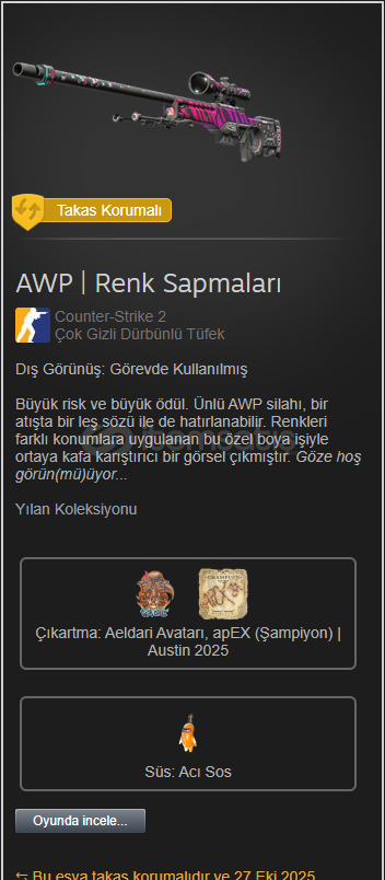 Açıklamayı okumadan almayınız skinin 1 hafta t.akas banı vardır t.akas banı biyince teslim yapılcaktır.Skinin t.akas baanı 27 ekimde bitcektir.