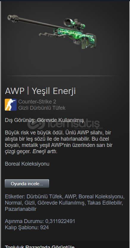 Dış Görünüş: Görevde KullanılmışAşınma Durumu: 0,311922491Büyük risk ve büyük ödül. Ünlü AWP silahı, bir atışta bir leş sözü ile de hatırlanabilir. Bu özel boyalı, metalik yeşil AWP'nin üzerinden sarı bir çizgi geçer. Enerji arttı.görsel temsilidir.
