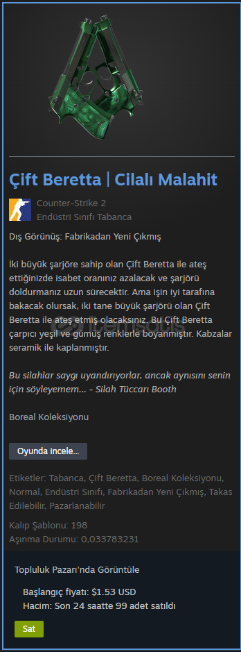 Pazarda minimum 1.53 dolardan işlem görüyor. Float değerini bilmediğim için 0 olarak girildi.