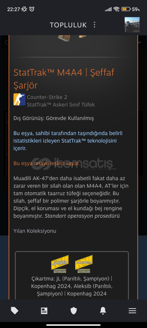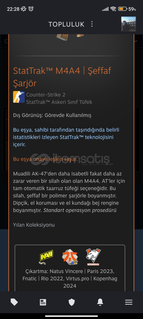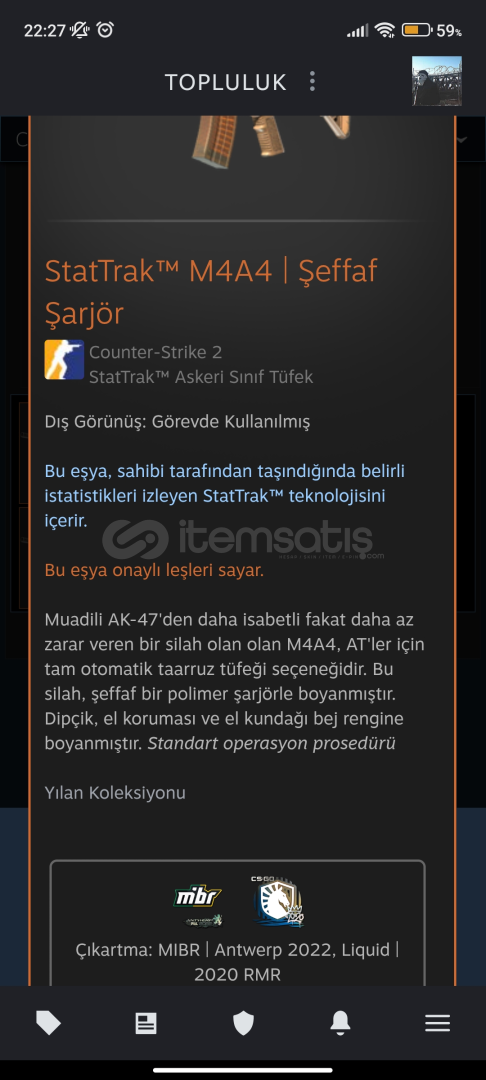 StatTrak™ M4A4 | Şeffaf Şarjör - FT (görevde kullanılmış)--Bu eşya, sahibi tarafından taşındığında belirli istatistikleri izleyen StatTrak™ teknolojisini içerir.-*Bu eşyanın istatistikleri Steam Tkas ya da Topluluk Pazarı'nda kullanıldığında sıfırlanacaktır.-İlanı Aldım Ama Bana Nasıl vericeksin?-Steam Trade URL nizi yazmanız yeterlid...