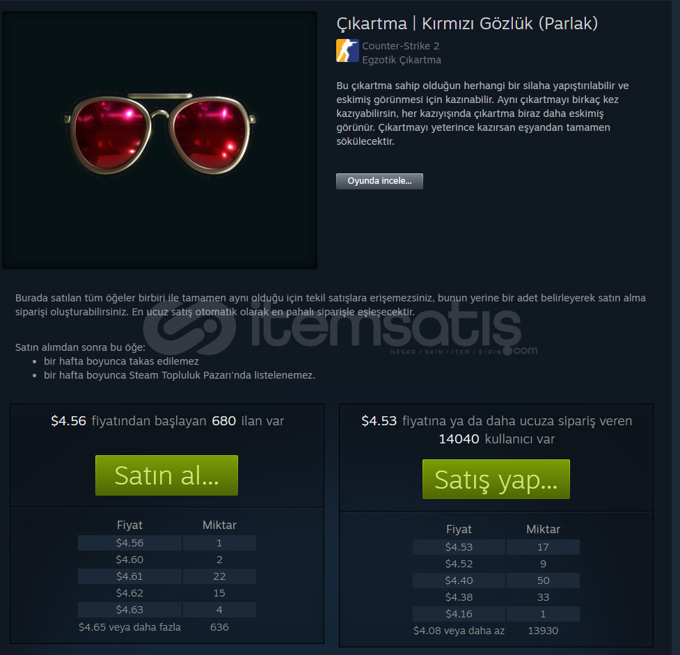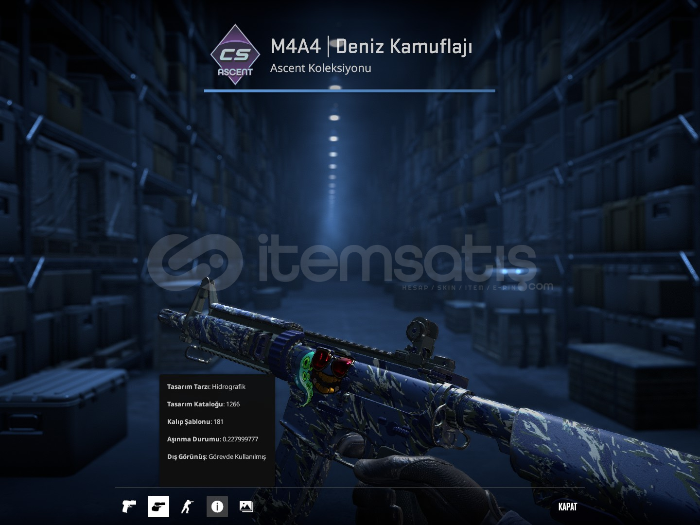 M4A4 | Deniz KamuflajıDış Görünüş: Görevde KullanılmışÇıkartmalar:Kırmızı Gözlük (Parlak) $4.61Altın Dişler (Parlak) $2.58Derin Sulardan $0.34💲$7.53 =314,67 TL----------------------------------------İlanı Aldım Ama Bana Nasıl vericeksin?-Steam Trade URL nizi yazmanız yeterlidir.-Hafta İçi 08.00-00.00-Hafta Sonu 12.00-01.00-NOT!:size skini verdikten so...
