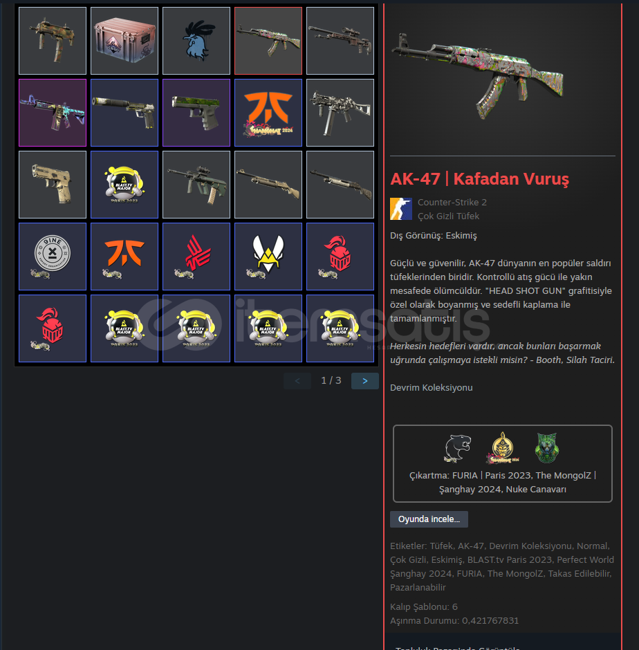 CS AK-47AK-47HEADSHOTDış Görünüş: WWFloat: 0.42176783084869385Nadirlik: Çok gizli