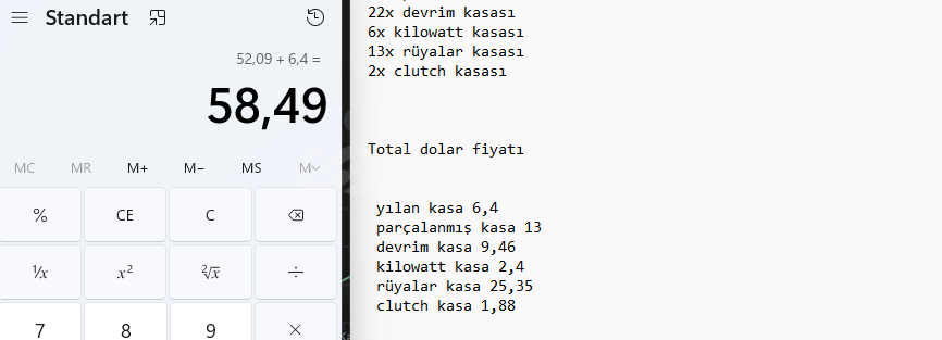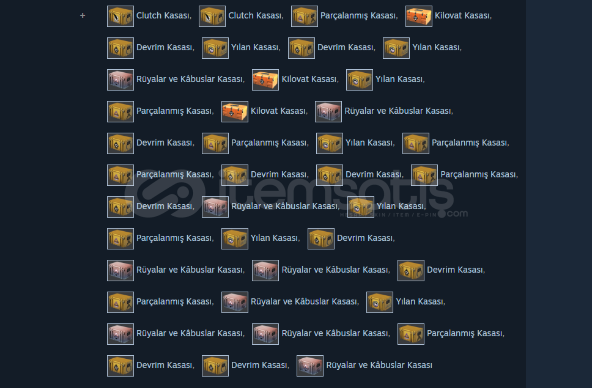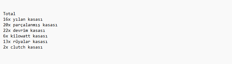 16x yılan kasası20x parçalanmış kasası22x devrim kasası6x kilowatt kasası13x rüyalar kasası2x clutch kasasıdaha fazla kasa elime gelecek bunların hepsi total