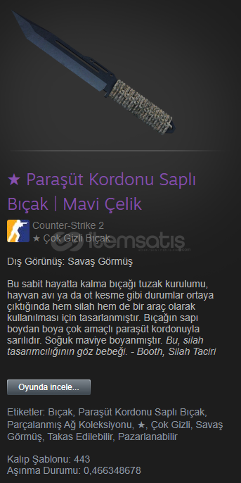 CS2 Paraşüt Kordonu Saplı Bıçak Mavi Çelik