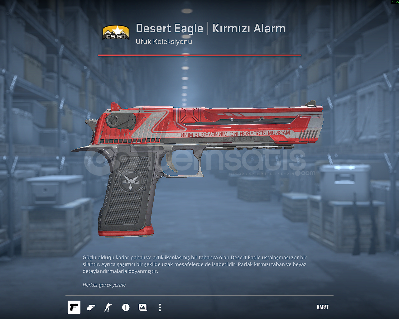 Güçlü olduğu kadar pahalı ve artık ikonlaşmış bir tabanca olan Desert Eagle ustalaşması zor bir silahtır. Ayrıca şaşırtıcı bir şekilde uzak mesafelerde de isabetlidir. Parlak kırmızı taban ve beyaz detaylandırmalarla boyanmıştır. Herkes görev yerine