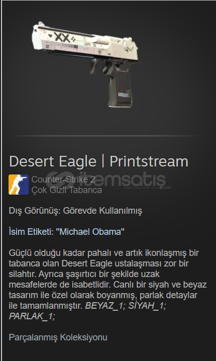 Dış Görünüş: Görevde KullanılmışAşınma Durumu: 0,350185037Güçlü olduğu kadar pahalı ve artık ikonlaşmış bir tabanca olan Desert Eagle ustalaşması zor bir silahtır. Ayrıca şaşırtıcı bir şekilde uzak mesafelerde de isabetlidir. Canlı bir siyah ve beyaz tasarım ile özel olarak boyanmış, parlak detaylar ile tamamlanm...