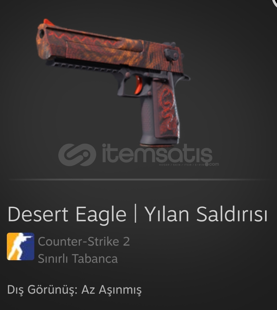Güçlü olduğu kadar pahalı ve artık ikonlaşmış bir tabanca olan Desert Eagle ustalaşması zor bir silahtır. Ayrıca şaşırtıcı bir şekilde uzak mesafelerde de isabetlidir. Turuncu ve kırmızı yılan derisi deseniyle özel olarak boyanmıştır. Yılaaaaan! Ateş KoleksiyonuAşınma Durumu: 0,144266203