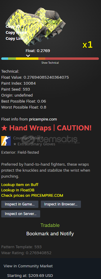★ El Sargıları | DİKKAT! (Görevde Kullanılmış)★ Hand Wraps | CAUTION!Tür : EldivenlerNitelik : ★Nadirlik : OlağandışıDış Görünüş : Görevde KullanılmışFloat: 0.27