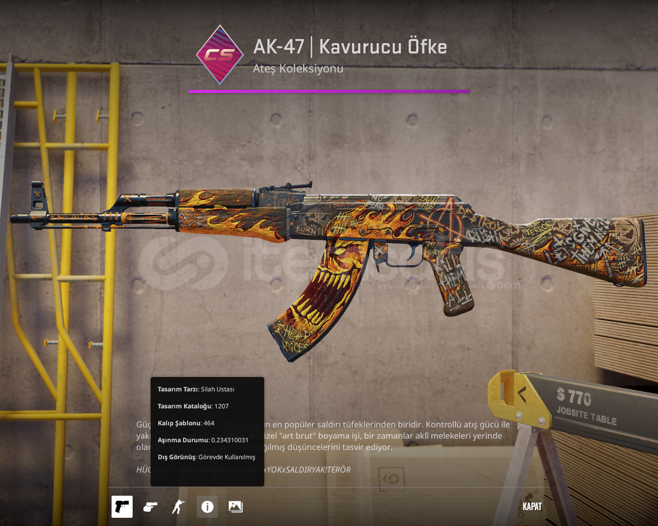 Diğer satıcılar gibi float değeri yazmayıp rastgele aşınmış skinler göndermiyorum :)