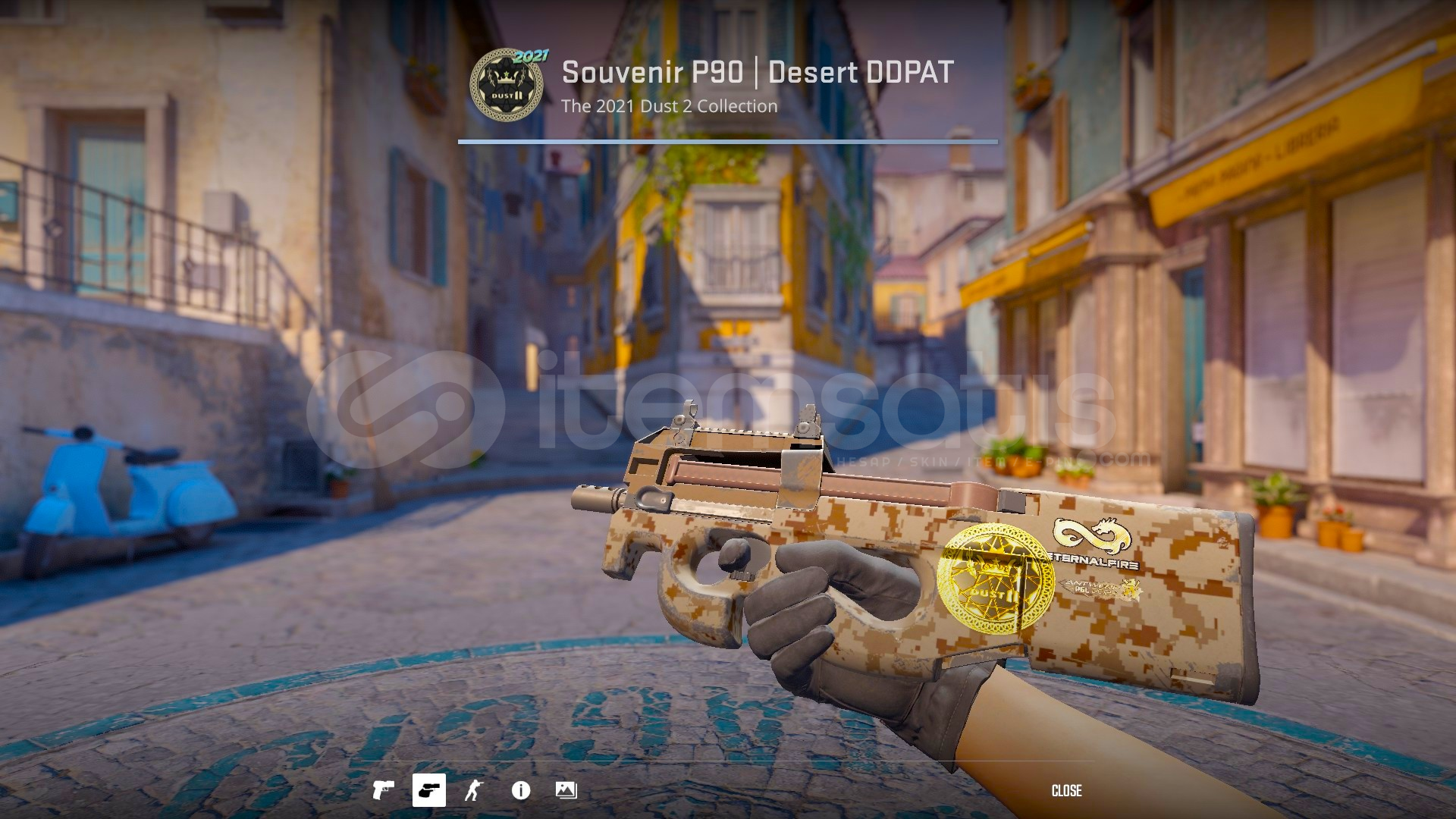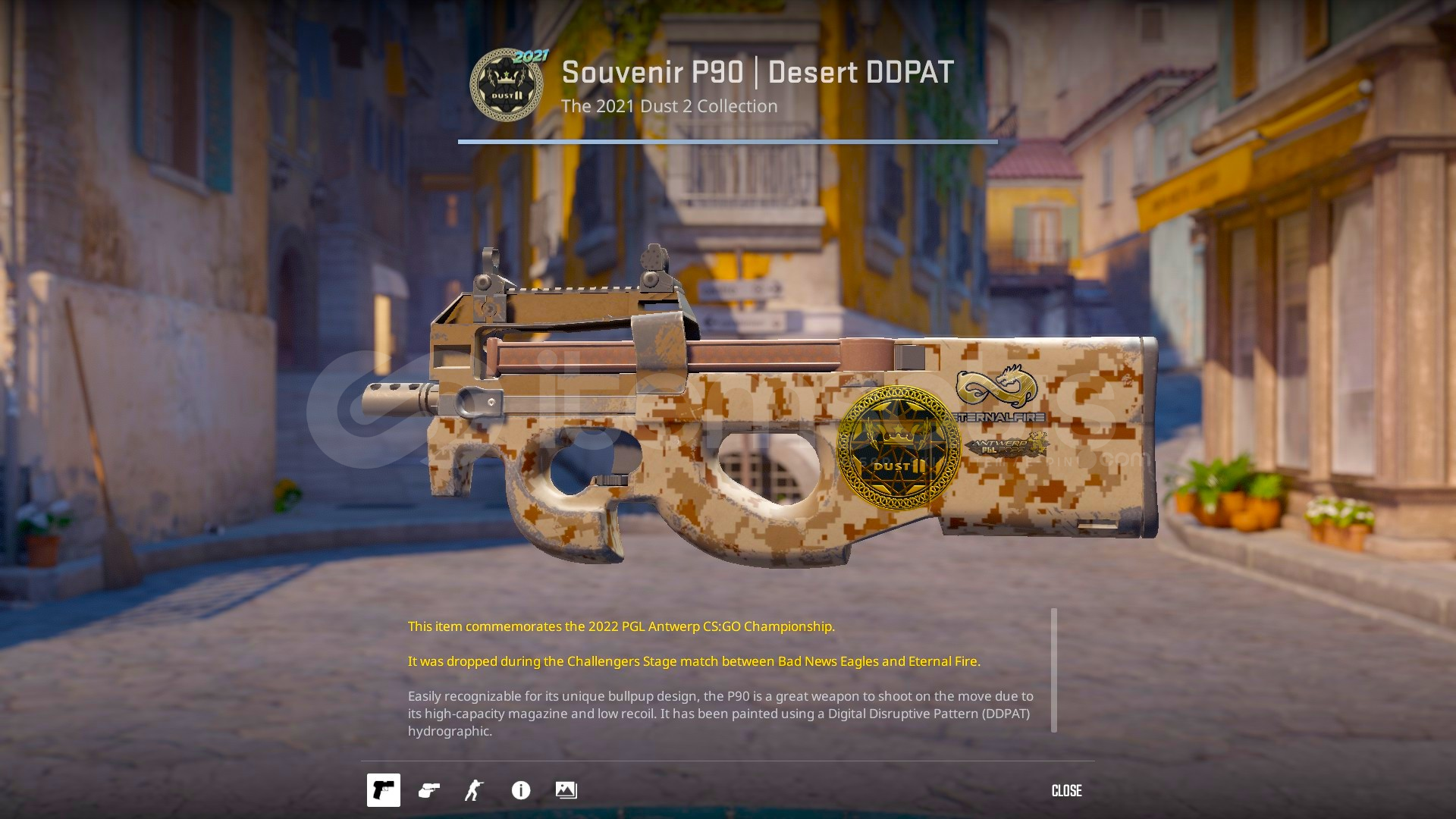 P90 | Çöl DDPATDış Görünüş: Görevde KullanılmışÇıkartma: Eternal Fire (Altın) | Antwerp 2022, Dust II (Altın)