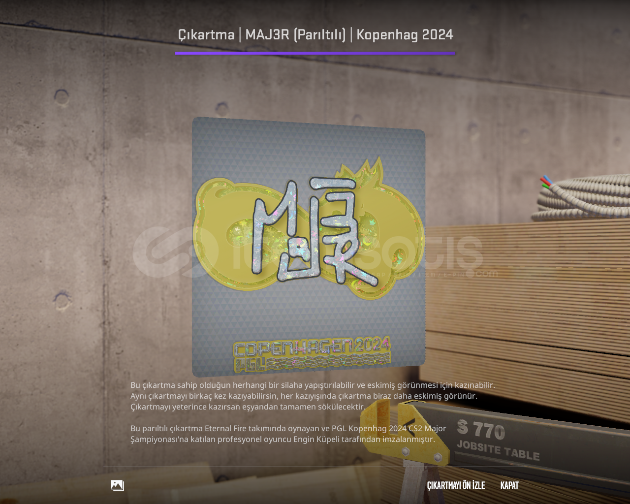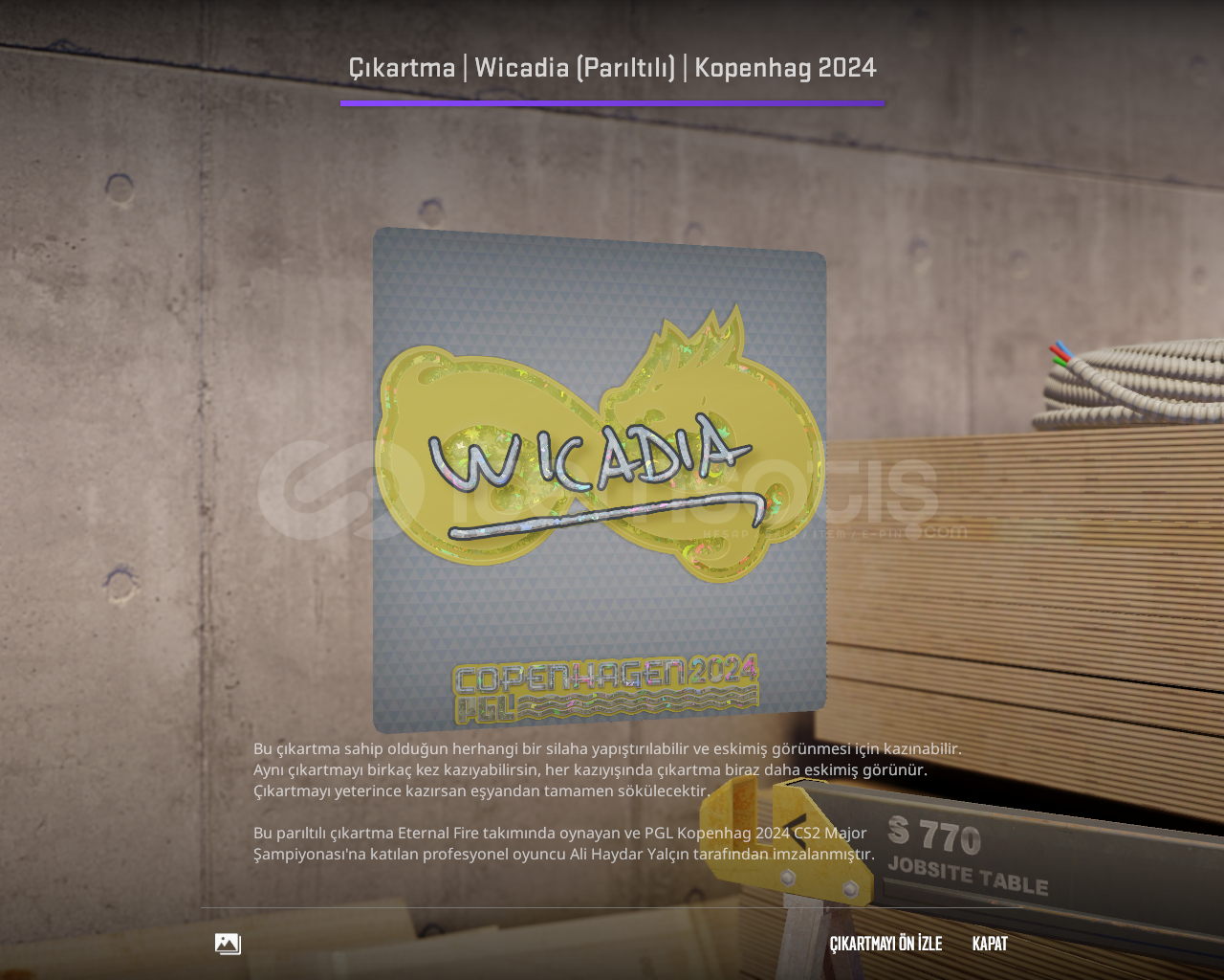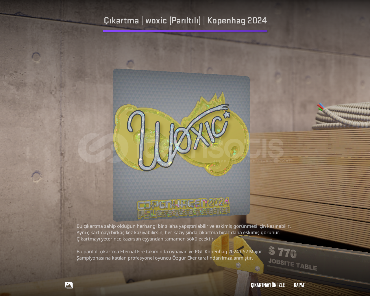 ⚡Eternal Fire Kopenhag 2024 Çıkartma 4'lü Set⚡(Parıltılı)woxic (Parıltılı) | Kopenhag 2024 - $0.20Calyx (Parıltılı) | Kopenhag 2024 - $0.12MAJ3R (Parıltılı) | Kopenhag 2024 - $0.17Wicadia (Parıltılı) | Kopenhag 2024 - $0.14Toplam: 28 TLBu eşya PGL Kopenhag 2024 CS2 Major Şampiyonası anısınadır.══════════&...