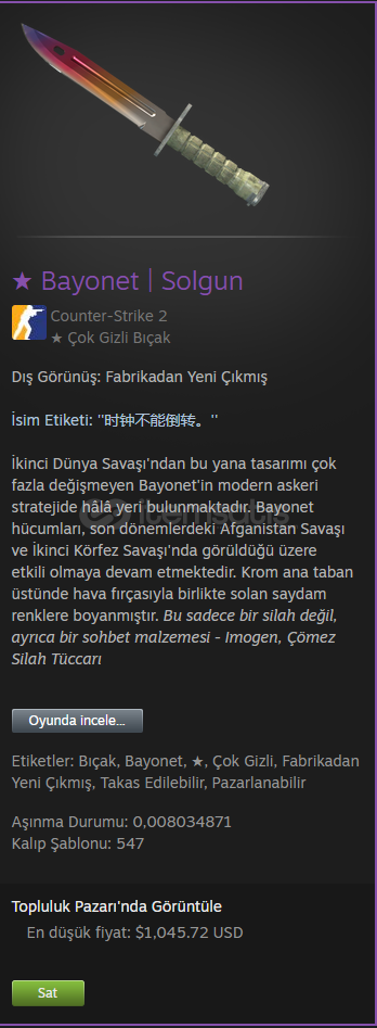 Bayonet Fade FNAşınma Durumu: 0,008034871Steam Profil Linki;https://steamcommunity.com/profiles/76561198808763918