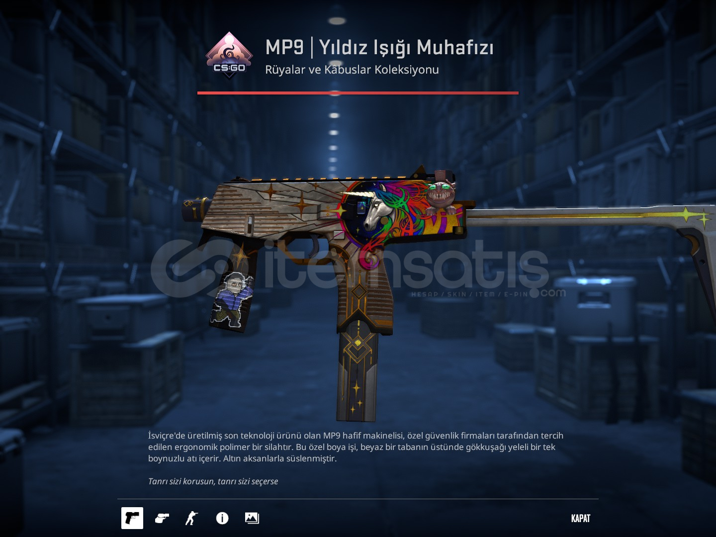 MP9 | Yıldız Işığı MuhafızıÇok Gizli Hafif MakineliDış Görünüş: Görevde Kullanılmış------------------------------------Çıkartma: Ayrı PiksellerSüs: Tombik $0.17 USD----------------------------------------İlanı Aldım Ama Bana Nasıl vericeksin?-Steam Trade URL nizi yazmanız yeterlidir.-Hafta İçi 08.00-00.00-Hafta Sonu 12.00-01.00-NOT!:size skin...