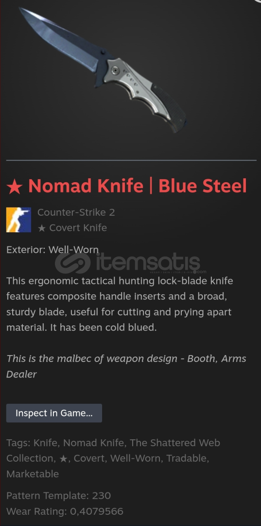 Tür : BıçakSilah : Göçebe BıçağıKoleksiyon : Parçalanmış Ağ KoleksiyonuNitelik : ★Nadirlik : Çok GizliDış Görünüş : EskimişAçılır ve kilit mekanizmasına sahip olan bu ergonomik taktiksel avcı bıçağı, ayrıca kompozit saplara ve bir şeyleri kesmek ya da kanırtmak için kullanılabilecek güçl&uu...