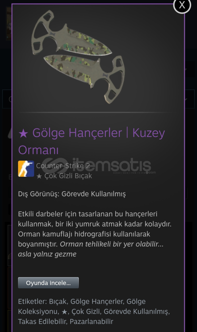 Dış Görünüş: Görevde Kullanılmış Etkili darbeler için tasarlanan bu hançerleri kullanmak, bir iki yumruk atmak kadar kolaydır. Orman kamuflajı hidrografisi kullanılarak boyanmıştır. Orman tehlikeli bir yer olabilir... asla yalnız gezme