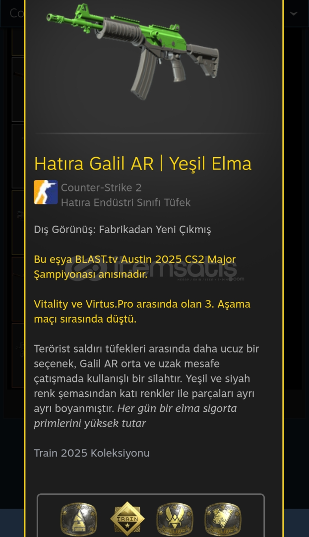 Satın aldıktan sonra trade linki gönder. Trade banın olmasın.Sticker:BLAST.Tv (Altın)Mirage (Altın)The Mongolz (Altın)Vanity (Altın)Austin 2025