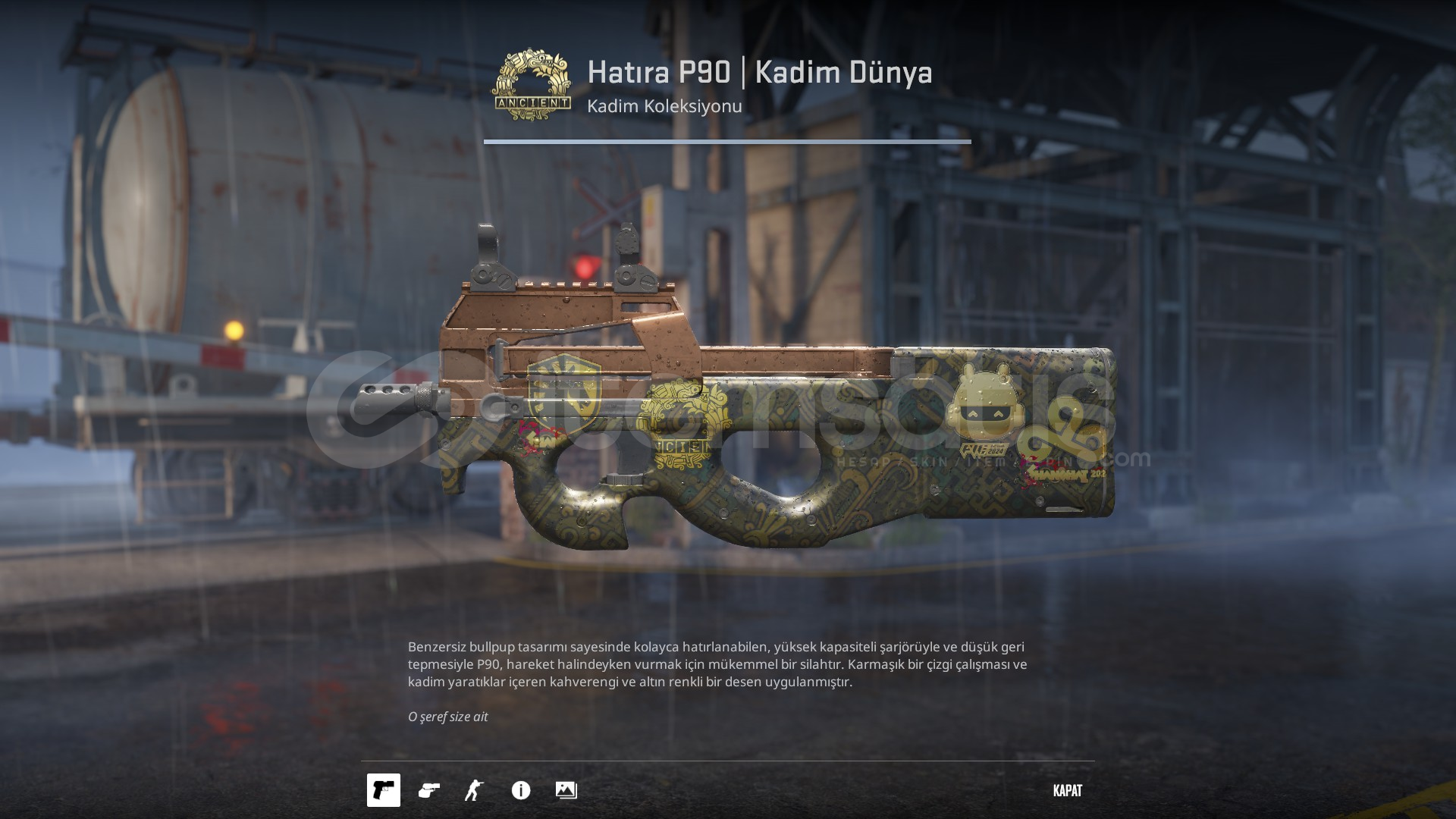 Hatıra P90 | Kadim Dünyaİlan resmi temsilidir(stokların içindeki skinlerden birine aittir.)Steam hesabınızın envanter gizliliği, herkese açık olmalıdır.Steam hesabınızda trade banı olmamalıdır.Çevrimiçi olmamı beklemeden satın alabilirsiniz.Daha fazla ilan için mağazama göz atabilirsiniz.NOT!:Steam Guard eklediyseniz 15 gün, Steam adın...