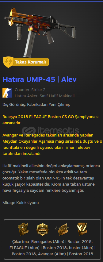 Hatıra UMP-45 | Alev FNÇıkartma | buster (Altın) | Boston 2018 380 Dolar