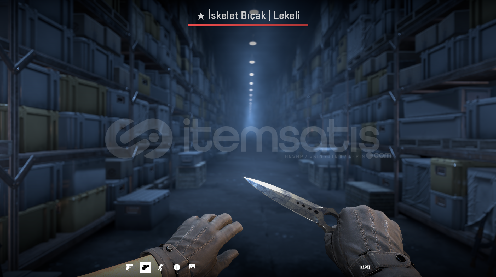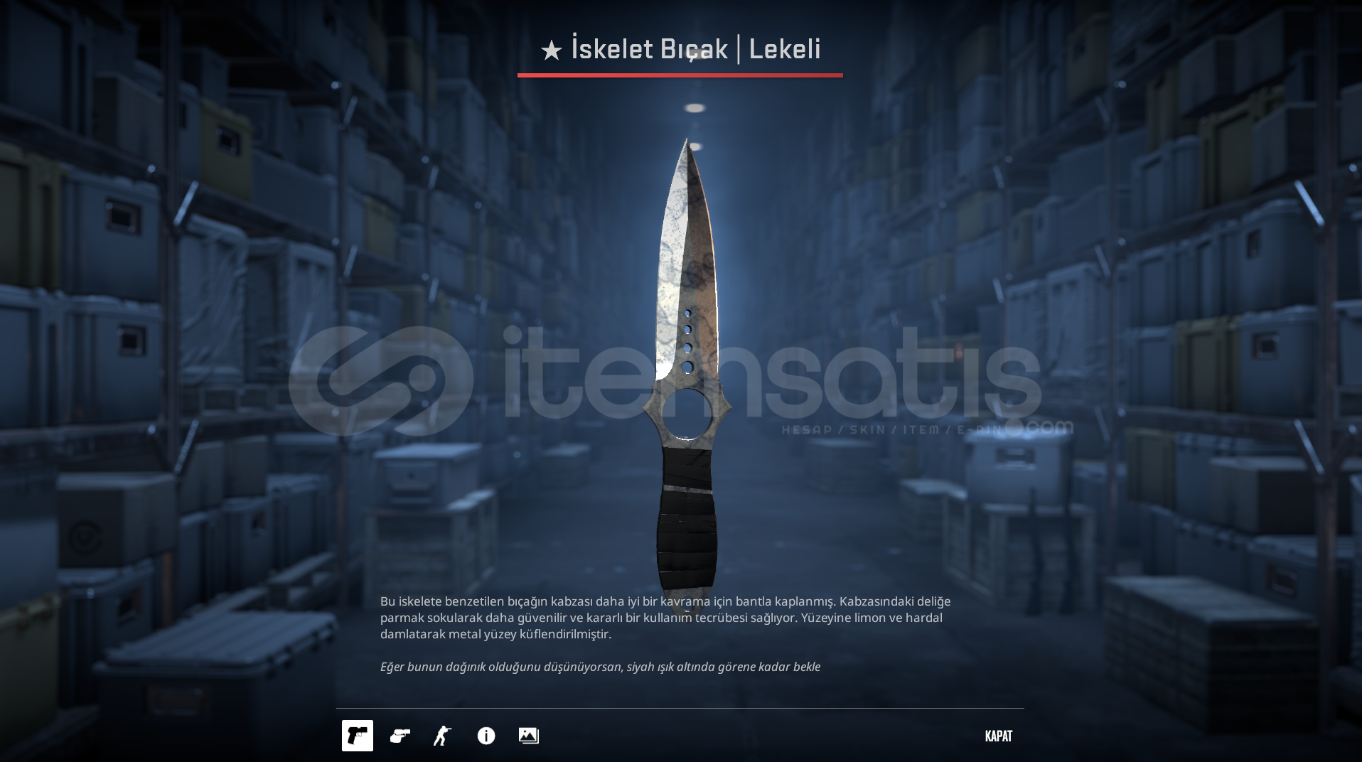 Bu iskelete benzetilen bıçağın kabzası daha iyi bir kavrama için bantla kaplanmış. Kabzasındaki deliğe parmak sokularak daha güvenilir ve kararlı bir kullanım tecrübesi sağlıyor. Yüzeyine limon ve hardal damlatarak metal yüzey küflendirilmiştir. Eğer bunun dağınık olduğunu düşünüyorsan, siyah ışık altında görene kadar b...
